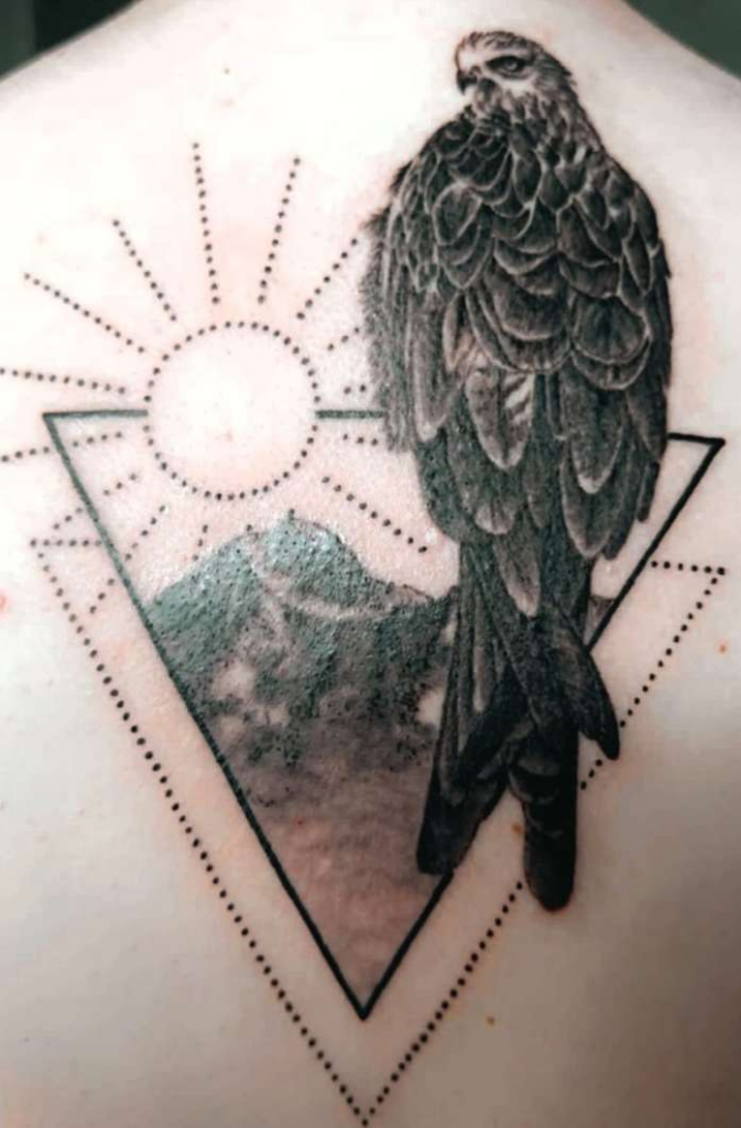 Das Bietschhorn begleitet die heute 20-jährige Silja seit ihrer Kindheit. Sie machte immer Skiferien im Lötschental. Den dazugehörigen Steinadler hat ihr muskelkranker Bruder im Lötschental fotografiert. Sie sagt: «Mein Bruder hat nicht eine sehr grosse Lebenserwartung, und ich weiss, dass ich ihn sehr wahrscheinlich einmal verlieren werde. Es war ein grosses Bedürfnis, diese Bietschhorn-Steinadler-Verbindung schon jetzt auf meinen Rücken tätowieren zu lassen. Mein Bruder ist im Lötschental sehr glücklich, geniesst die Natur und beobachtet stundenlang Tiere, er hat schon viele sehr schöne gelungene Fotos gemacht. Ihn glücklich zu sehen, macht auch mich glücklich.»