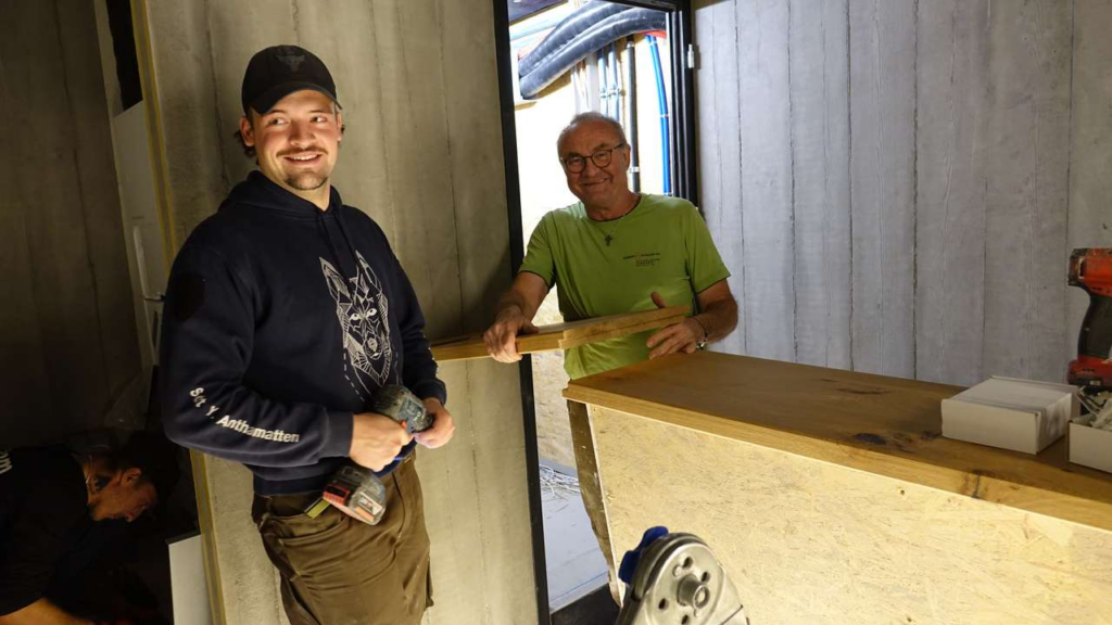 Dominik Bumann und Yannis Anthamatten beim Bau der Bar im neuen Club.